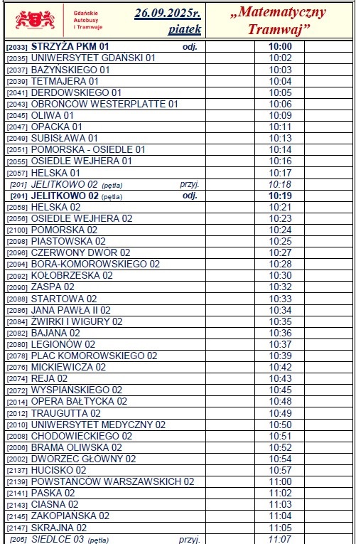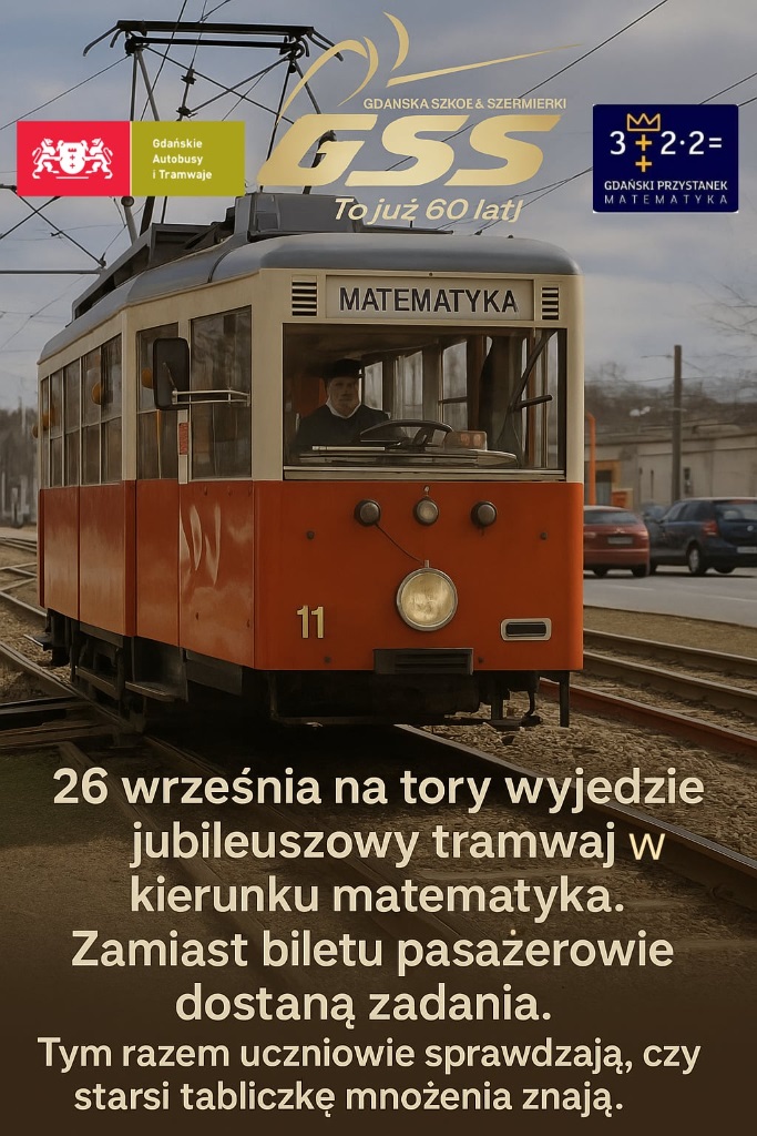 W ramach obchodów 60 lecia Szkoły Podstawowej nr 70 ( Gdańskiej Szkoły Szermierki) na tory wyjedzie zabytkowy tramwaj w kierunku MATEMATYKA. Pasażerowie, mieszkańcy Gdańska i goście zamiast biletów otrzymają zadania do rozwiązania. A wolontariusze z Gdańskiej Szkoły Szermierki sprawdzą poprawność rozwiązań. Podczas podróży oprócz powtórzenia tabliczki mnożenia będzie można zyskać informacje o tej niezwykłej szkole. Rozklad jazdy poniżej: